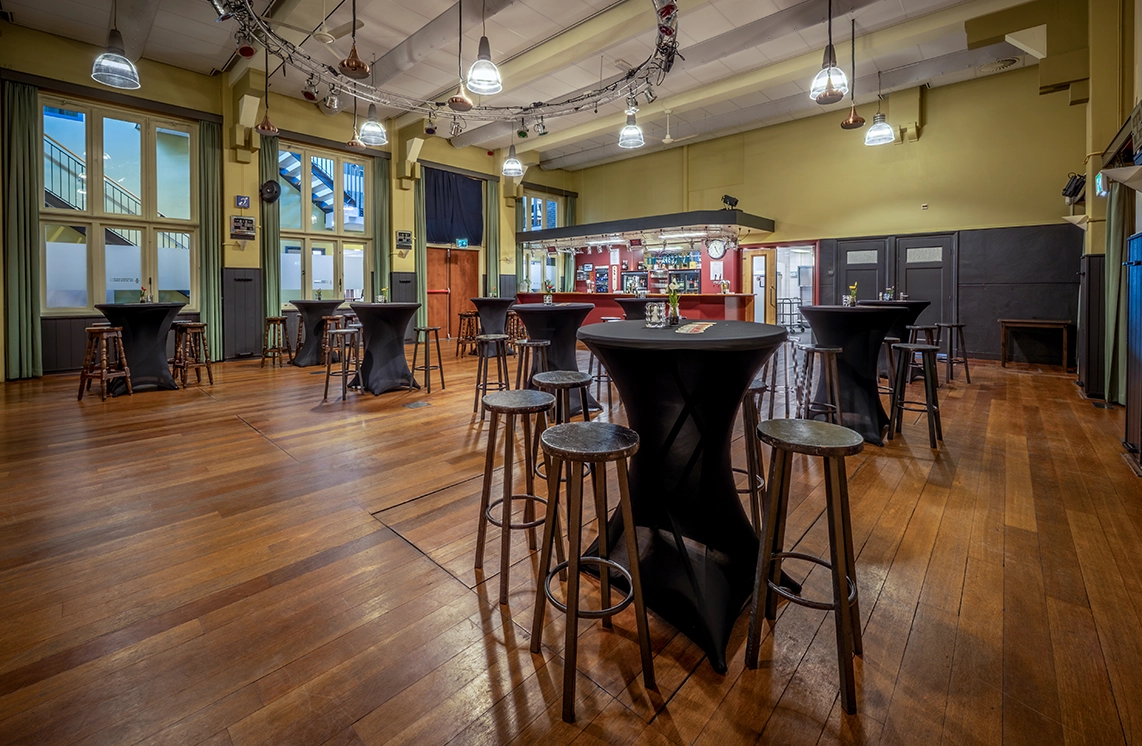 In deze ruimte kan gebruikt worden gemaakt van een complete licht- en geluidsinstallatie. Tevens is een vaste beamer met een scherm van 3×4 meter aanwezig. De ruimte is door middel van een schuifwand in 2 gedeeltes te splitsen. Het ene deel vormt dan de biljartzaal van 150 m2 met 4 biljarts, welke in de grond verzinkbaar zijn, en een bar. Het andere deel vormt de toneelzaal van 100 m2.